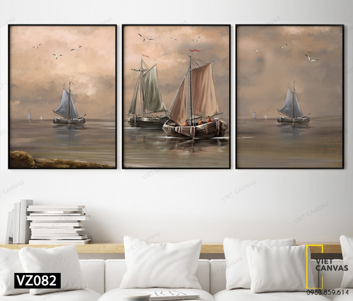 Bộ 3 Tranh thuyền ra khơi lúc hoàng hôn